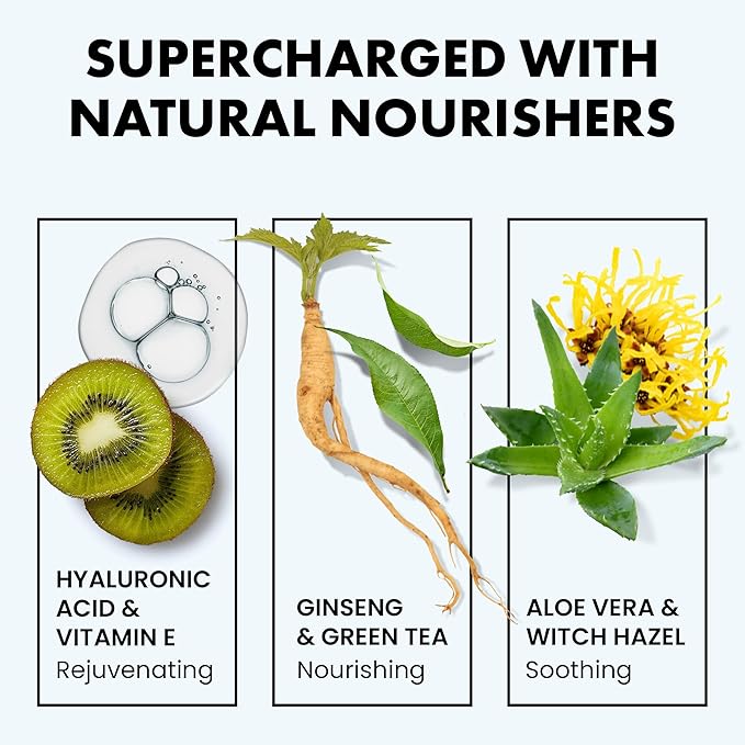 - POWERFUL ANTIOXIDANT BLEND: Infused with green tea, aloe vera, and ginseng, this antioxidant-rich formula supports skin’s natural radiance while delivering lasting hydration. With 2.5% hyaluronic acid, it helps maintain a plump, refreshed complexion.