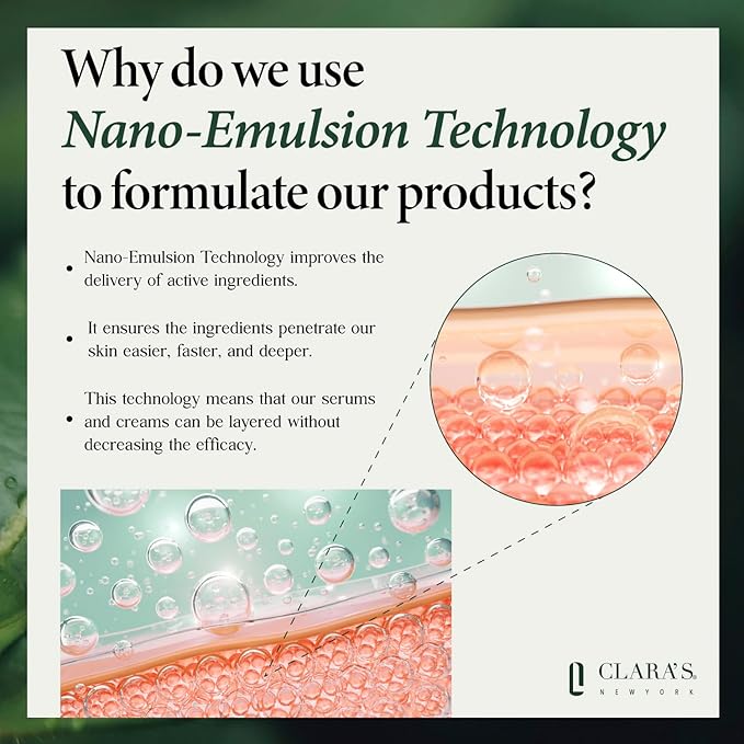 - [FOR CONSCIOUS CONSUMERS] Clara’s New York is a clean beauty brand. This product contains NO synthetic colors, parabens, sulfates, phthalates, etc. Formulated using nano-emulsion technology, the formulation is non-comedogenic, non-irritating, and penetrates the skin deeper and faster. If you are a clean beauty lover, this product is made for you.