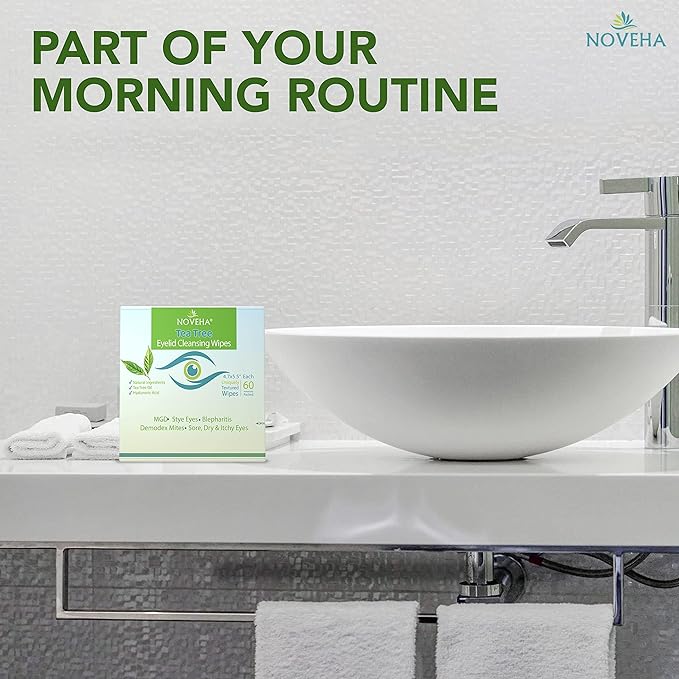 NOVEHA 120Pcs Tea Tree Oil Eyelid & Lash Wipes With Hyaluronic Acid, Green Tea & Chamomile For Blepharitis & Itchy Eyes, Individually Wrapped Eyelash Wipes, Natural Makeup Remover & Cleanser (2 Pack)