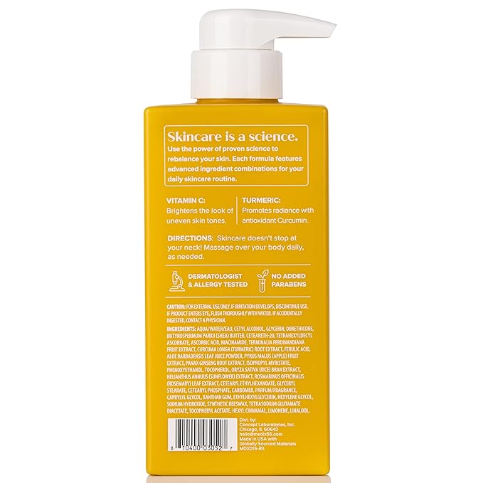 - VITAMIN C – Incorporating a Vitamin C infused body lotion into your daily skincare routine can help to promote a more healthy, radiant, & youthful-looking complexion. Vitamin C helps promote an even skin tone, while also helping stimulate collection production to improve skin elasticity + firmness. Vitamin C also helps to minimize redness or irritation in the skin, helps protect from environmental stressors like UV rays, and helps reduce the appearance of fine lines, sun damage, & wrinkles.