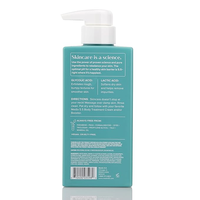 - SMOOTHING CLEANSE: Our glycolic acid body wash exfoliates and resurfaces rough and bumpy texture to reveal softer, smoother skin. The Alpha Hydroxy Acids within this exfoliating body wash prepares your skin for treatment body creams/lotions to effectively be applied by helping to remove the dry, dull skin that builds up on the surface of our skin. Dry skin can act like a shield that prevents active ingredients from penetrating.