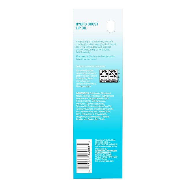 - .2-ounce tube of Neutrogena Hydro Boost Lip Oil with Hyaluronic Acid, a glossy, hydrating lip oil in a flattering light pink shade that nourishes & enhances the appearance of lips, bringing out their natural color