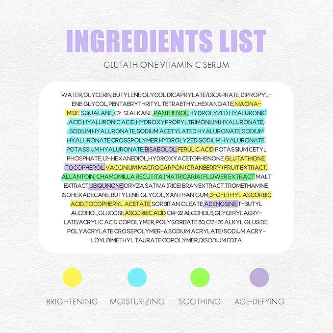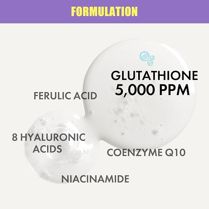 - [5000ppm Glutathione + Vitamin C for Radiance] Glutathione is a powerful antioxidant that targets dark spots at the source — helping to prevent new spots and fade existing discoloration. Paired with Vitamin C, it enhances brightness and boosts overall skin clarity. Perfect for restoring a smooth, even-toned glow.